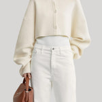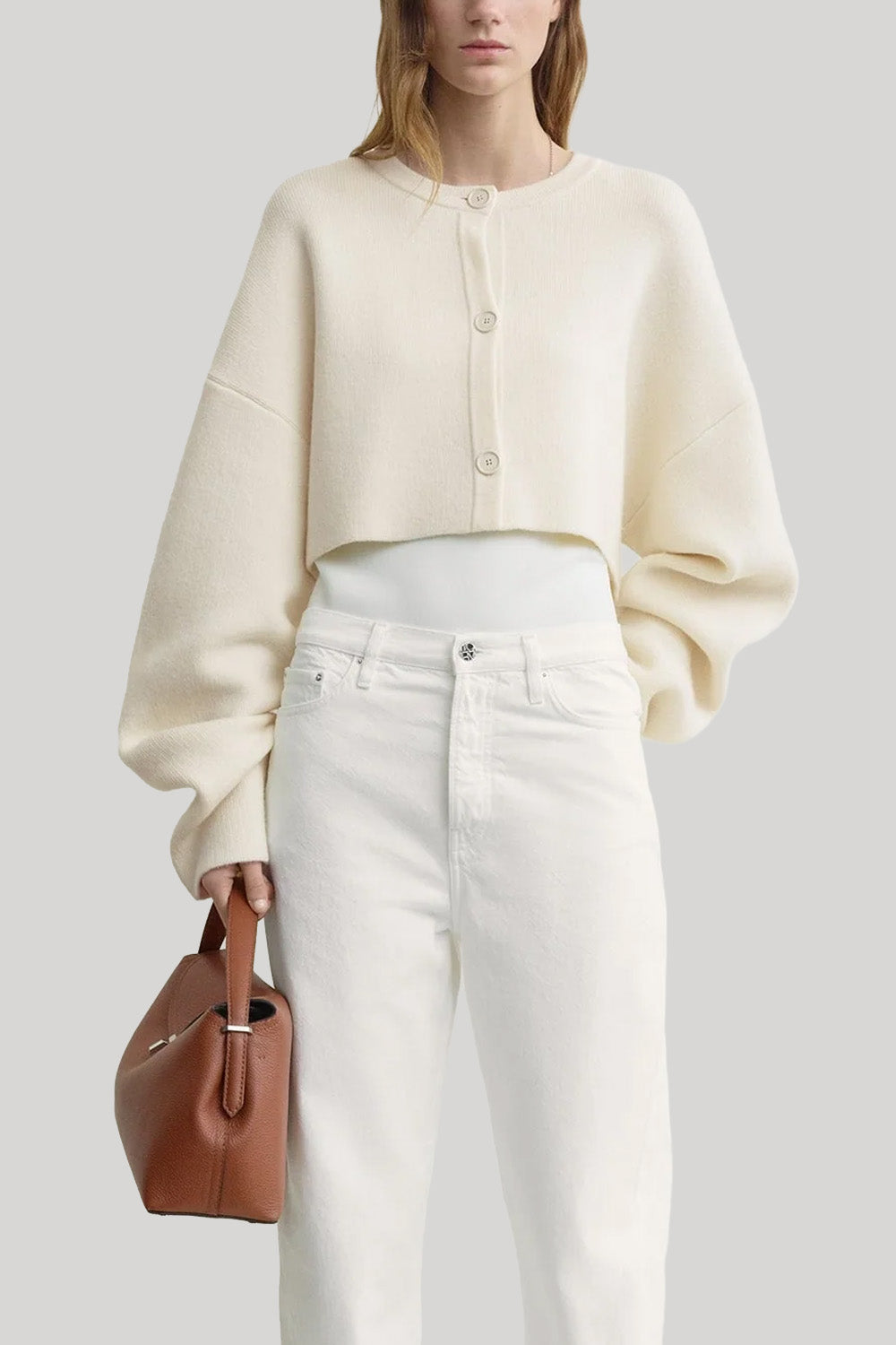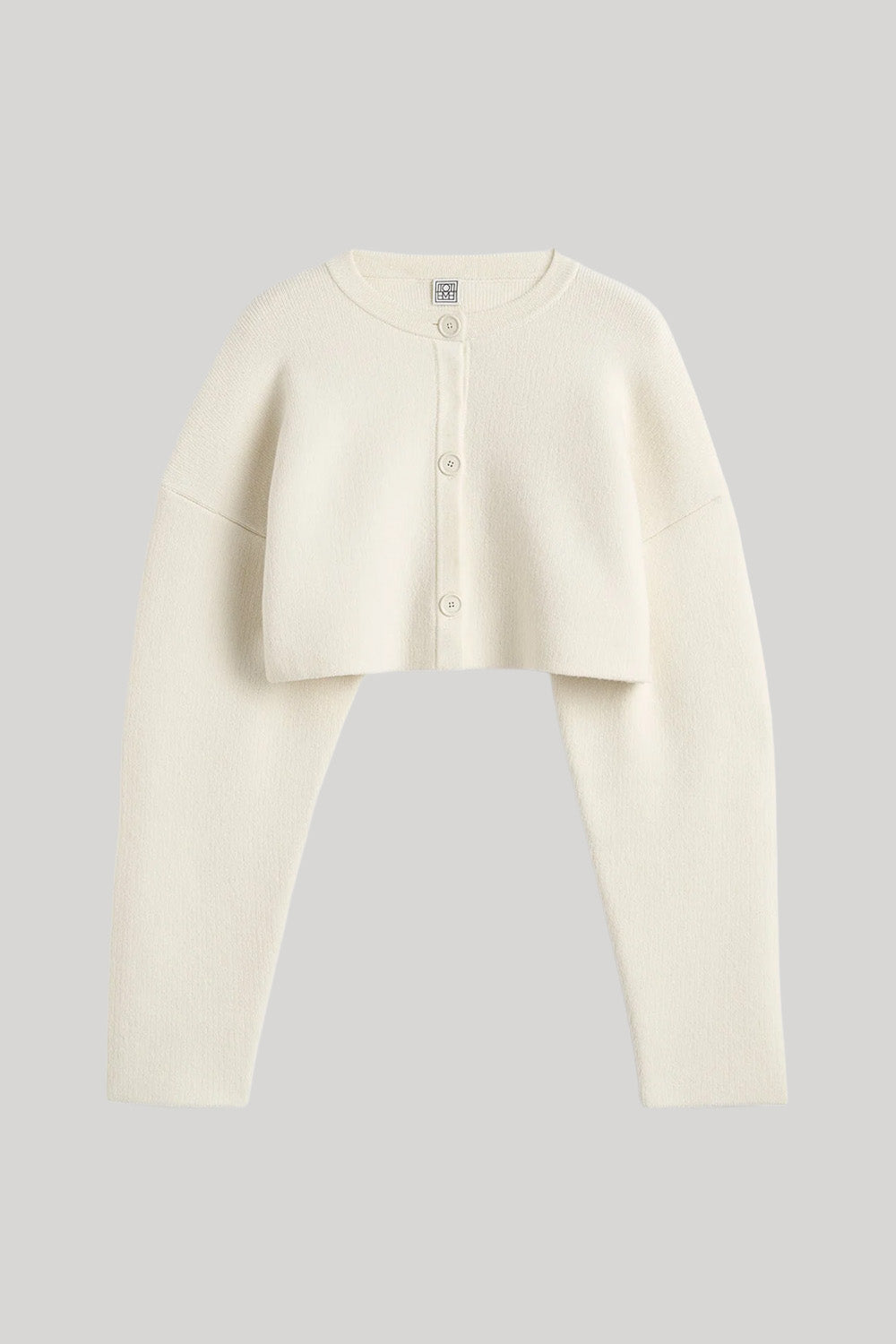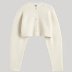 Cardigan knitted from double-faced wool to a cropped, oversized silhouette with voluminous sleeves that extend past the fingertips. Metal buttons fasten the front, creating a sculptural statement piece that ends at the ribcage. Pair with high waist trousers or a long slip dress.