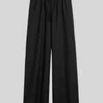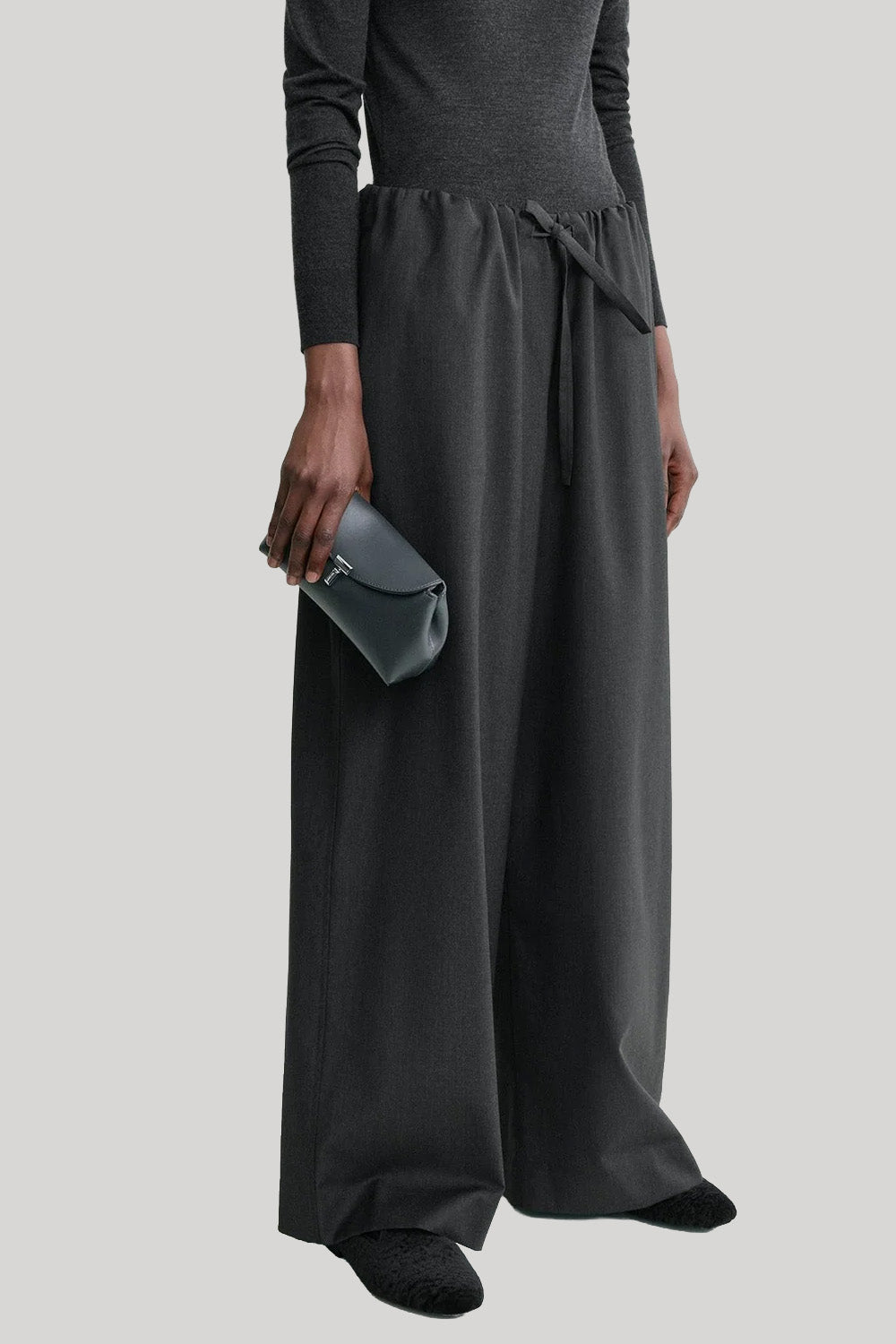 These wide trousers are styled with a coordinating blouse as part of a sophisticated dinner look – expressing our penchant for set dressing. They are tailored from fluid wool with an elasticated drawstring waistband that folds inward to create voluminous gathers.