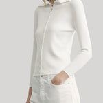 Cardigan inspired by the classic lines of a polo shirt. It is knitted from a smooth viscose blend with a high collar, button front closure and fitted silhouette with slightly cropped sleeves.