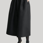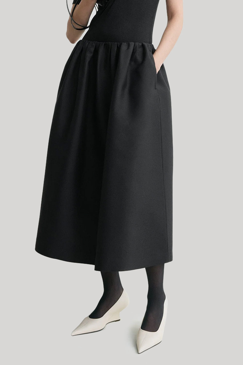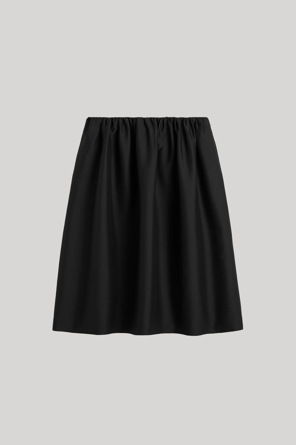 A feminine evening skirt made from a lustrous wool-silk blend that billows from the waist, creating graceful gathers. Offset the sculptural volume with a fitted top.