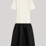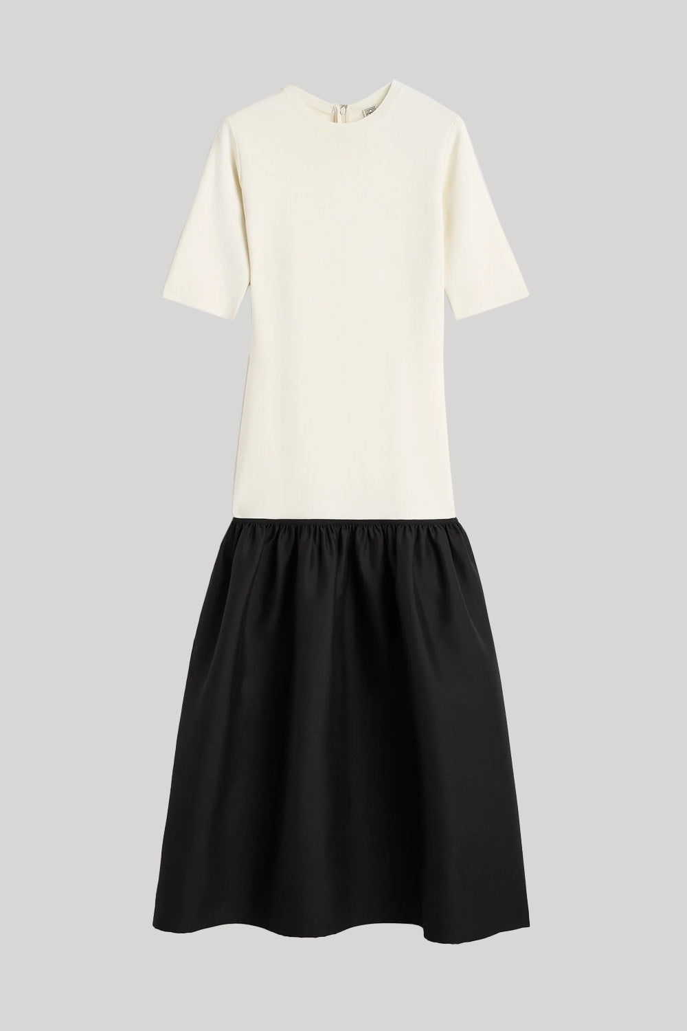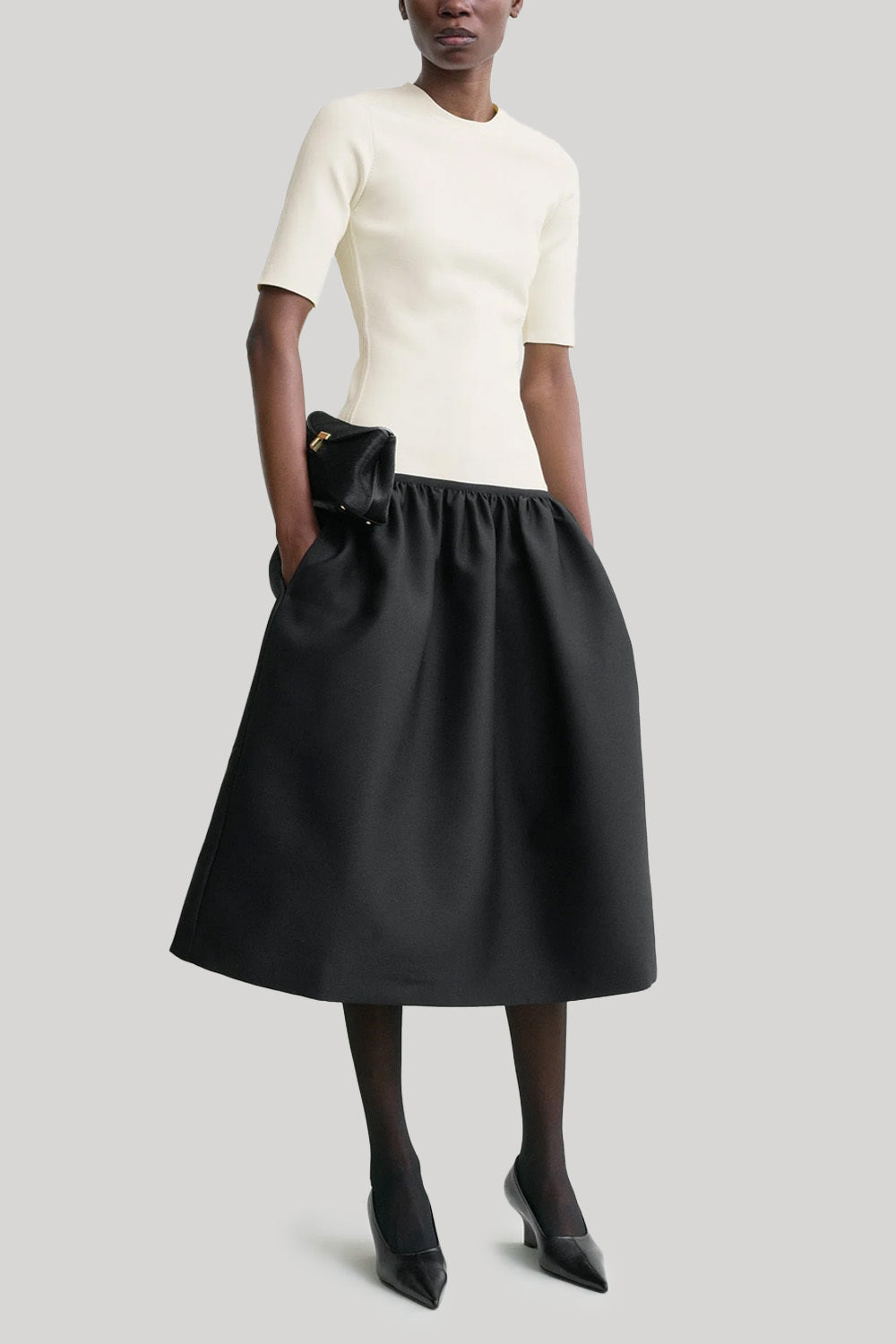 Sculptural evening dress that brings together our compact knit jersey tee and our full twinflower skirt. Gatherings around the drop waist create extra volume and texture. Slip your hands in the pockets to channel a nonchalant attitude.