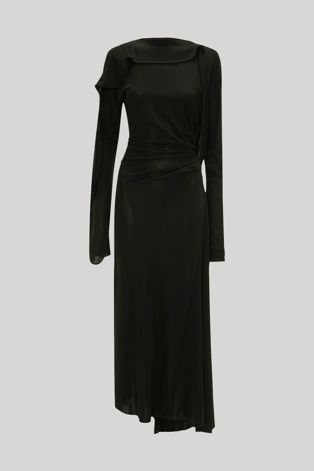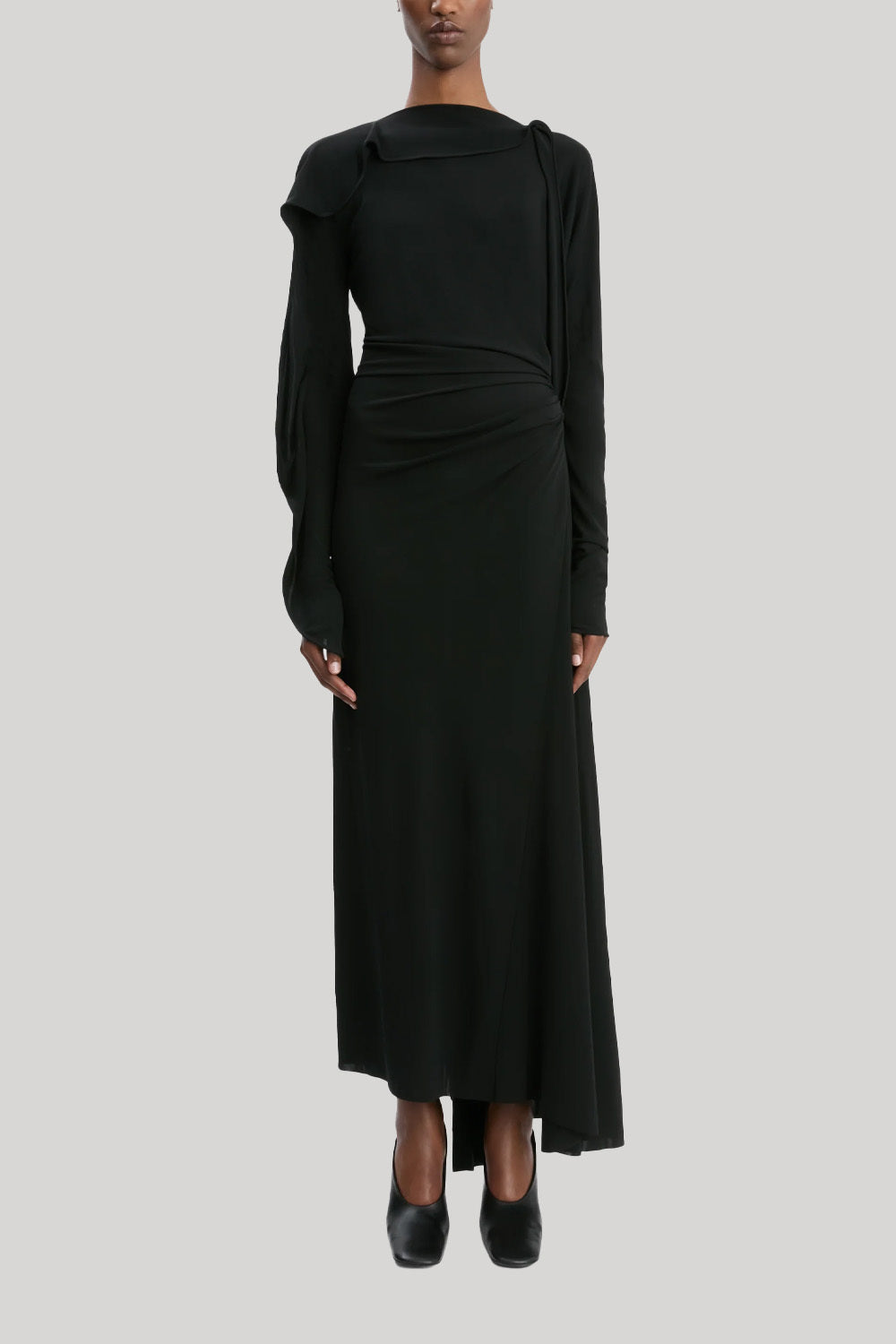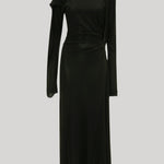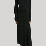 Discreet but directional talking points elevate the Long Sleeve Draped Jersey Midi Dress from a traditional LBD to a contemporary classic. Distinguished by its draped neckline with cord piping, it also features elegant draping at the sleeves and back skirt. The waistline is defined by tactile pleats, while an asymmetric hemline and sleeves add modern flair.