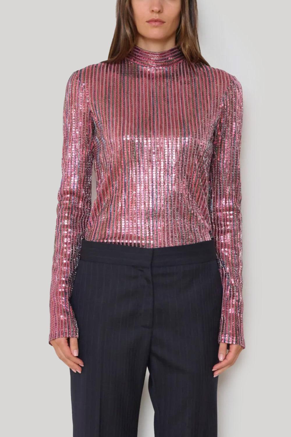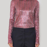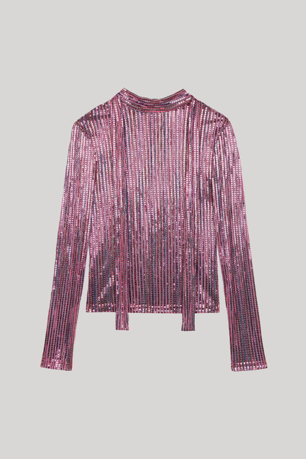 A modern rebellion in light. The Disco Top is a sleek statement piece that reinterprets classic sparkle with a modern edge. Its shimmering fabric catches the light with every move, ensuring you command attention without saying a word. Its high-neck silhouette and fluid tie details offer a versatile elegance, allowing you to style it with a feminine bow or a nonchalant knot. It is a piece that blurs the lines between bold glamour and minimalist sophistication.